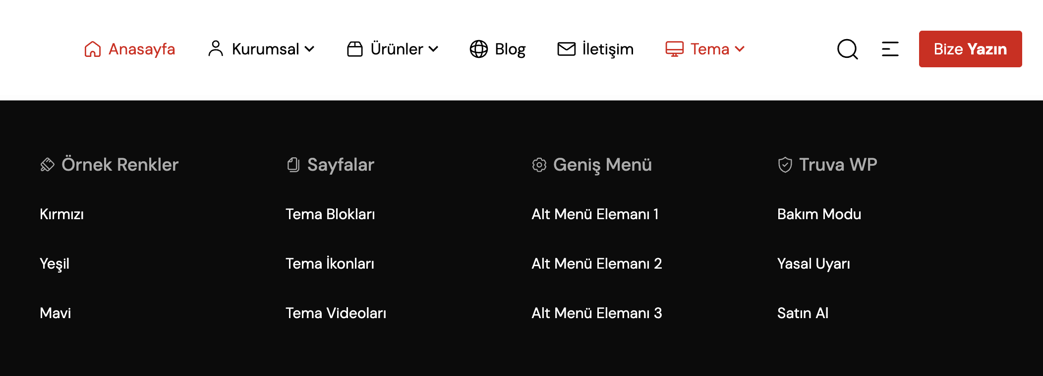 Truva WordPress Teması’ndaki tüm menü alanlarda Safir Menü isimli özel gutenberg bloğu kullanılmakdaır. Bu bloğu header menüsünde, mobil menüde, sidebarda yer alan menülerde, footerda veya temanın istediğiniz herhangi bir alanında kullanabilirsiniz. Menülerde ikon desteği de bulunmaktadır.